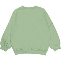Marika ist ein hellgrünes Sweatshirt mit einem Smiley-Print auf der Vorderseite, der einen Stern in einem Auge hat. Die Bluse hat einen gerippten Saum an Halsausschnitt, Ärmelenden und Saum.