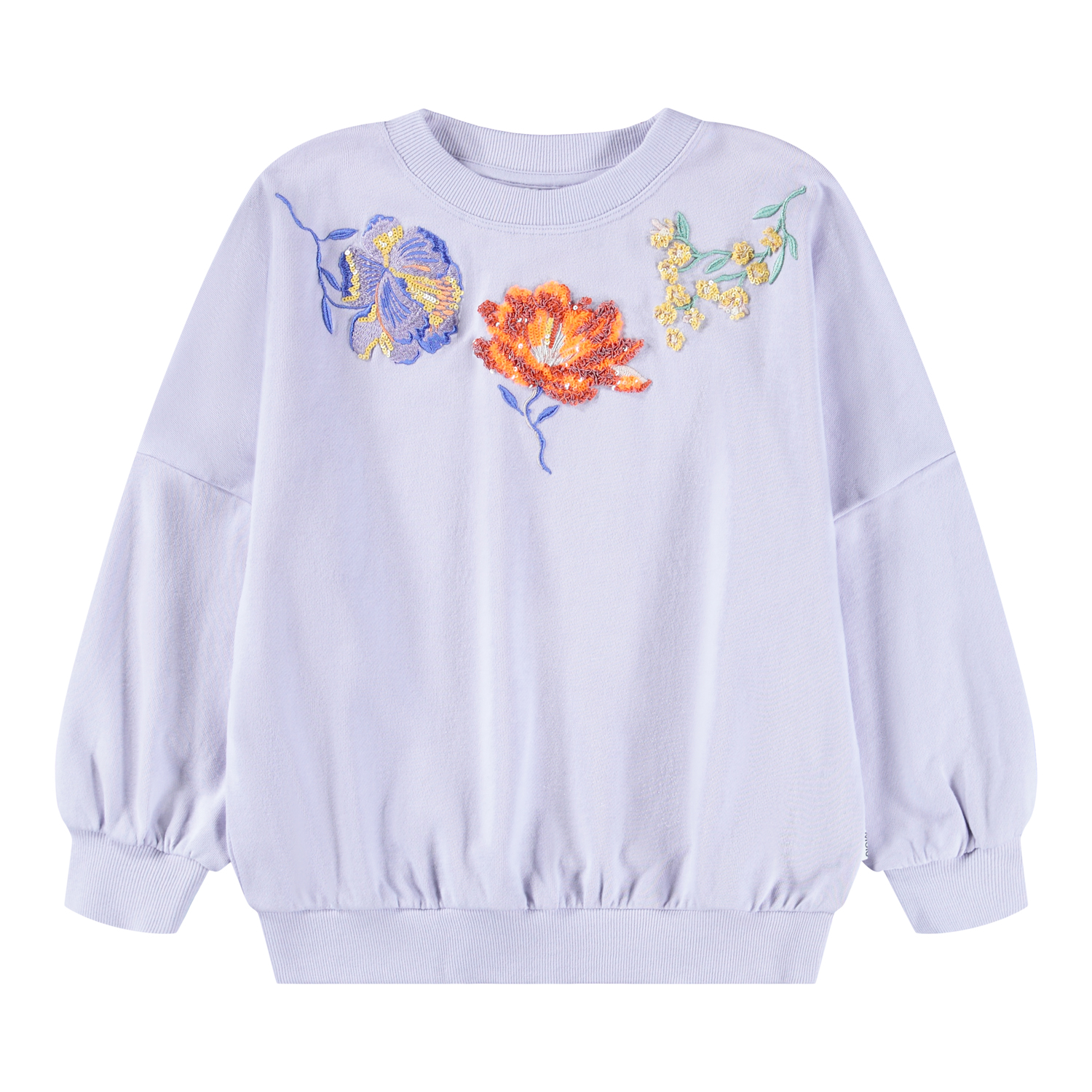 Hellvioletter Sweatshirt aus Öko-Baumwolle mit Blumenstickerei und Pailletten. Der Pullover hat einen Rundhalsausschnitt mit gerippten Kanten an den Ärmeln, am Hals und am Saum sowie eine lockere Passform.