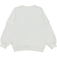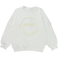 Marika ist ein weißes Sweatshirt mit einer lächelnden „Hello"-Stickerei in Gelb auf der Vorderseite. Marika ist an Hals, Handgelenken und Hüften gerippt.Dieses