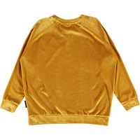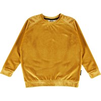 Marilee ist ein goldenes Velour-Sweatshirt. Die Bluse hat unten, am Ärmelende und am Hals eine Rippkante. Kombinieren Sie die Bluse mit der passenden Hose.