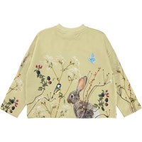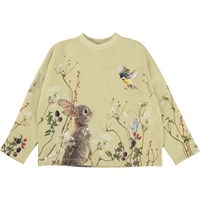 Marin ist ein grünes Sweatshirt mit einem Aufdruck eines Hasen auf der Vorderseite sowie Beeren und Blumen. Die Bluse hat eine lockere und weite Passform.
