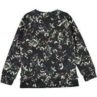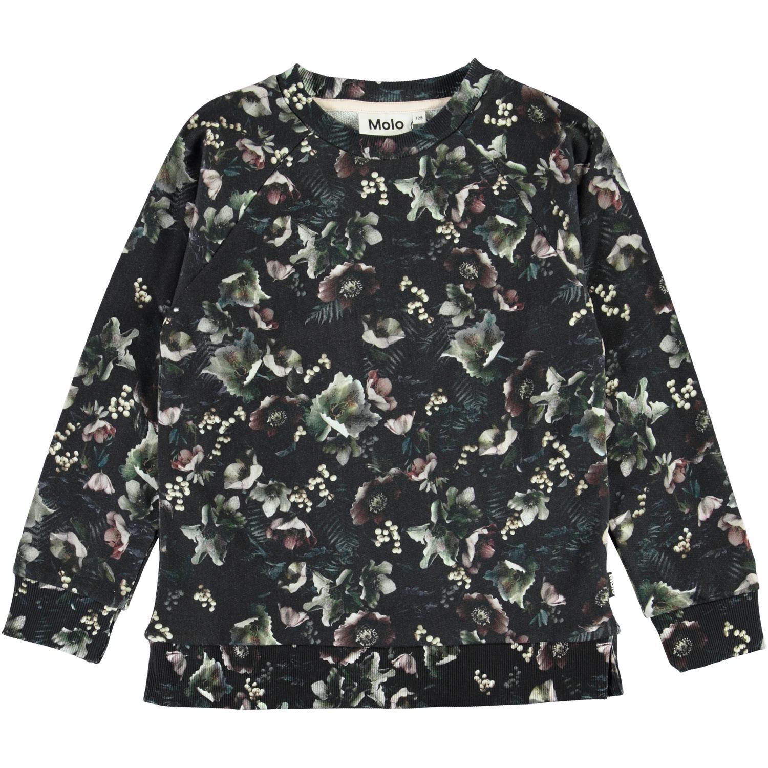 Marina ist ein dunkles Sweatshirt mit dem Text 'Moonlight Garden' als Blumen-Druck. Die Bluse hat unten, am Ärmelende und am Hals eine Rippkante. sowie einen kleinen Schlitz an den Seiten.