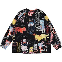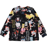 Mary ist ein schwarzes Sweatshirt mit Druck von Ninja-Katzen in tollen Farben. Die Bluse hat unten, am Ärmelende und am Hals eine Rippkante. sowie einen kleinen Schlitz an den Seiten. Kombinieren Sie die Bluse mit einem passenden Rock.