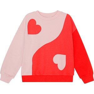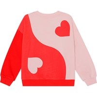 Rot-rosa Sweatshirt aus Öko-Baumwolle. Das Sweatshirt hat einen Rundhalsausschnitt, Rippbündchen an Hals, Saum und Ärmeln sowie eine übergroße Passform. Das Sweatshirt ist auf der einen Seite rosa und auf der anderen rot und bildet ein großes Yin- und Yang-Zeichen.
