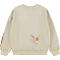 Beiges Sweatshirt aus Öko-Baumwolle. Das Sweatshirt hat eine lockere Passform, einen Rundhalsausschnitt, gerippte Abschlüsse und einen Aufdruck von Waldtieren.