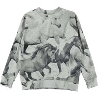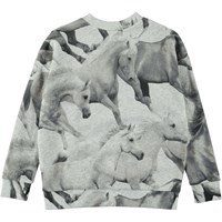 Maxi ist ein graues Sweatshirt mit Ton-in-Ton-Pferdedruck. Das Sweatshirt hat einen gerippten Rand an Hals, Saum und Ärmelabschluss. Kombinieren Sie das Sweatshirt mit der passenden Hose.