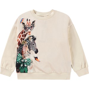 Off-weißes Sweatshirt aus Öko-Baumwolle mit gebürstetem Innenfutter, das weich und warm zu tragen ist. Das Sweatshirt hat eine lockere Passform, einen Rundhalsausschnitt, gerippte Abschlüsse und einen Druck auf der Vorderseite mit verschiedenen Tieren, alle schick angezogen und bereit zum Feiern.