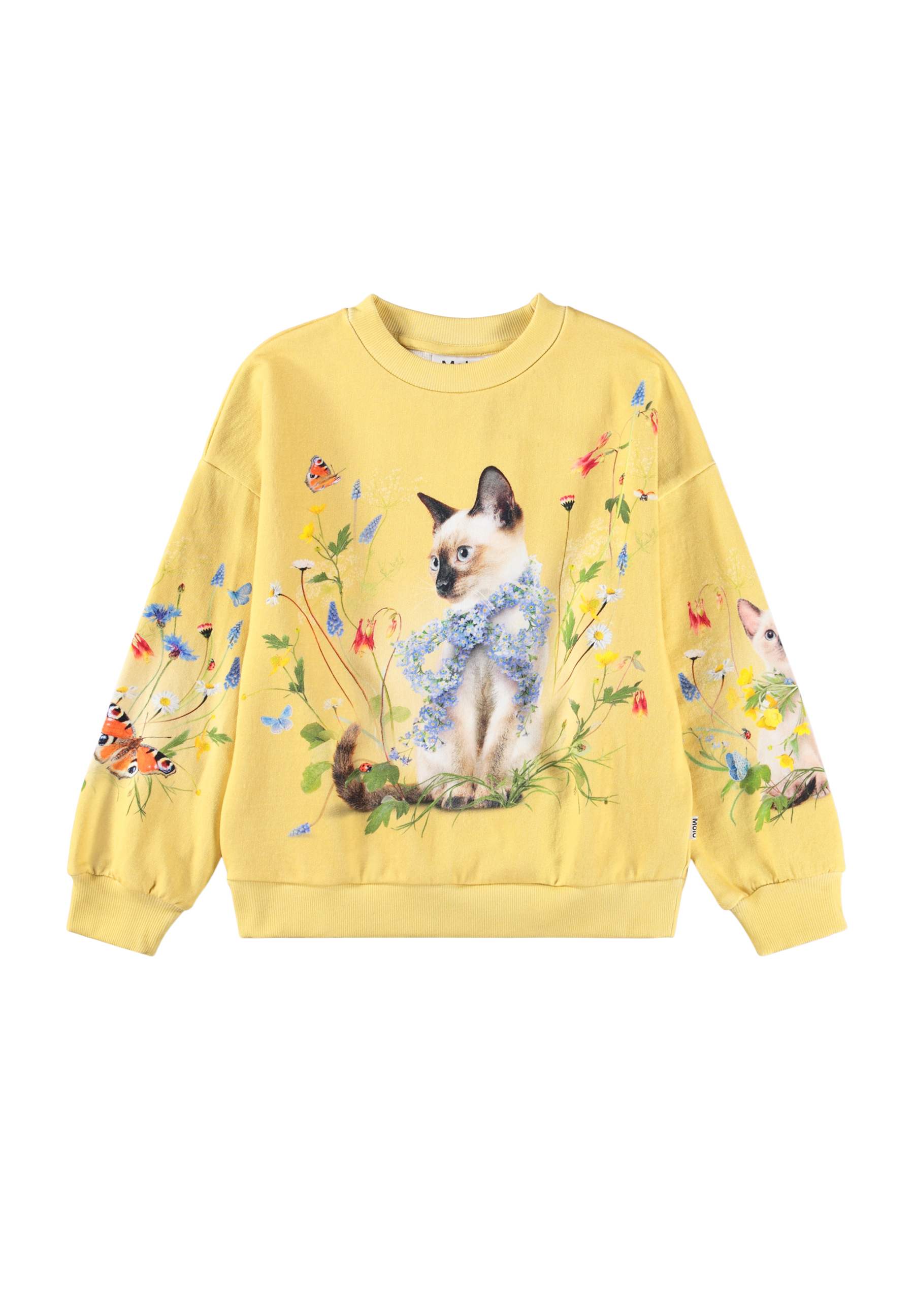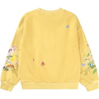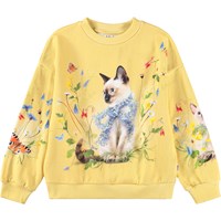 Gelbes Sweatshirt aus weicher, biologischer Baumwolle mit Rundhalsausschnitt und gerippten Kanten am Hals, an den Ärmeln und am Saum. Das Sweatshirt hat eine lockere und entspannte Passform mit einem Druck von Katzen, Schmetterlingen und bunten Sommerblumen.