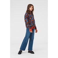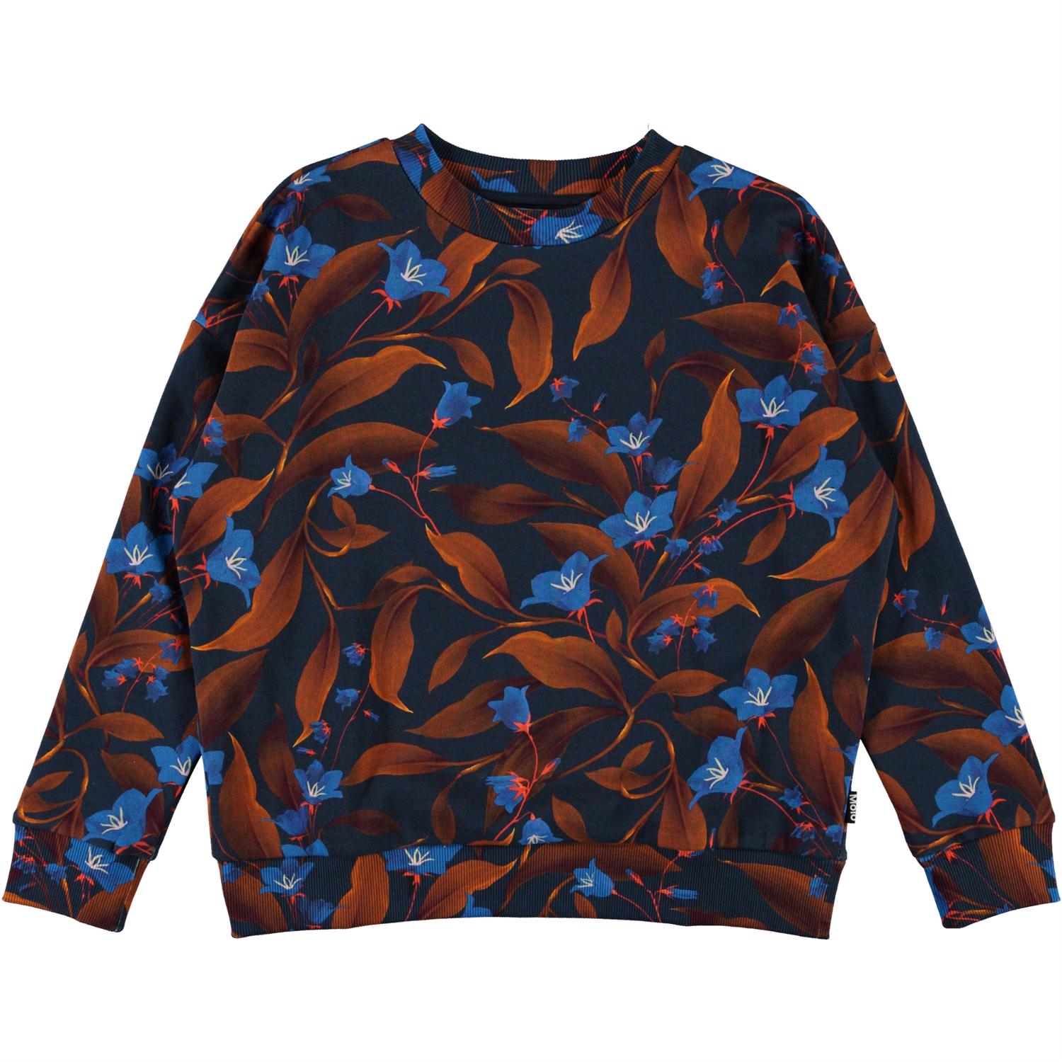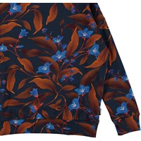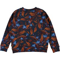 Maxi ist ein dunkles Sweatshirt mit einem Aufdruck von kleinen blaue Blumen. Das Sweatshirt hat eine oversized Passform.
