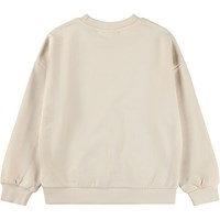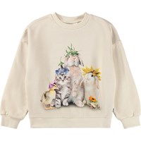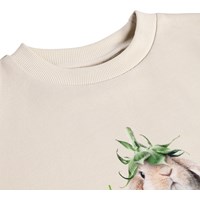 Beiges Sweatshirt aus weicher, biologischer Baumwolle mit Rundhalsausschnitt und gerippten Kanten am Hals, an den Ärmeln und am Saum. Das Sweatshirt hat eine lockere und entspannte Passform mit einem Druck von niedlichen Tieren mit Blumenhüten.