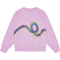 Rosa Sweatshirt aus weicher Öko-Baumwolle mit einer ungekämmten Innenseite, was es an heißen Tagen angenehm kühl macht. Das Sweatshirt hat eine lockere Passform, einen Rundhalsausschnitt und gerippte Bündchen an den Ärmeln, am Ausschnitt und am Saum. Es ist mit einer gestreiften Paillettenstickerei in den Farben der Olympischen Spiele verziert.