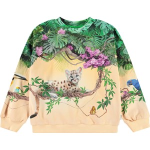 Hellorangefarbenes Sweatshirt aus weicher Öko-Baumwolle mit gerippten Kanten am Ausschnitt, an den Ärmeln und am unteren Saum des Sweatshirts. Das Sweatshirt hat eine lockere Passform mit einem bunten Druck eines üppigen Dschungels, lila Blumen, Pumajungen, Schmetterlingen und Papageien in den Ranken. Kombinieren Sie es mit passenden Hosen für ein komplettes Set.
