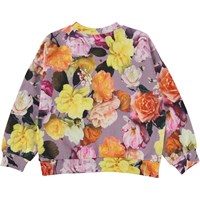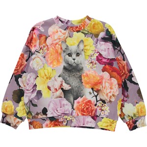 Maxi ist ein lila Sweatshirt aus 100 % Öko-Baumwolle. Das Sweatshirt ist an Hals, Handgelenken und Hüften gerippt. Der Maxi ist ganzflächig bedruckt mit Rosegarden Cat, wo eine kleine Katze die Rosen der Welt erkundet.