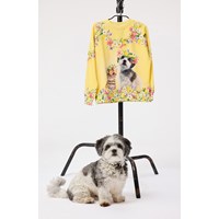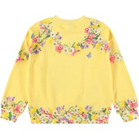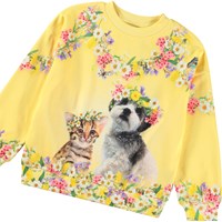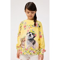 Gelbes Sweatshirt aus weicher Öko-Baumwolle mit gerippten Kanten am Hals, an den Ärmeln und am unteren Saum des Sweatshirts. Das Sweatshirt hat eine lockere Passform mit einem bunten Druck von Sommerblumen, einem Baby-Puma und dem süßen Bürohund Maggie.