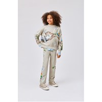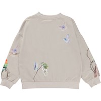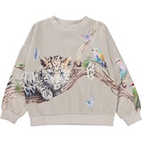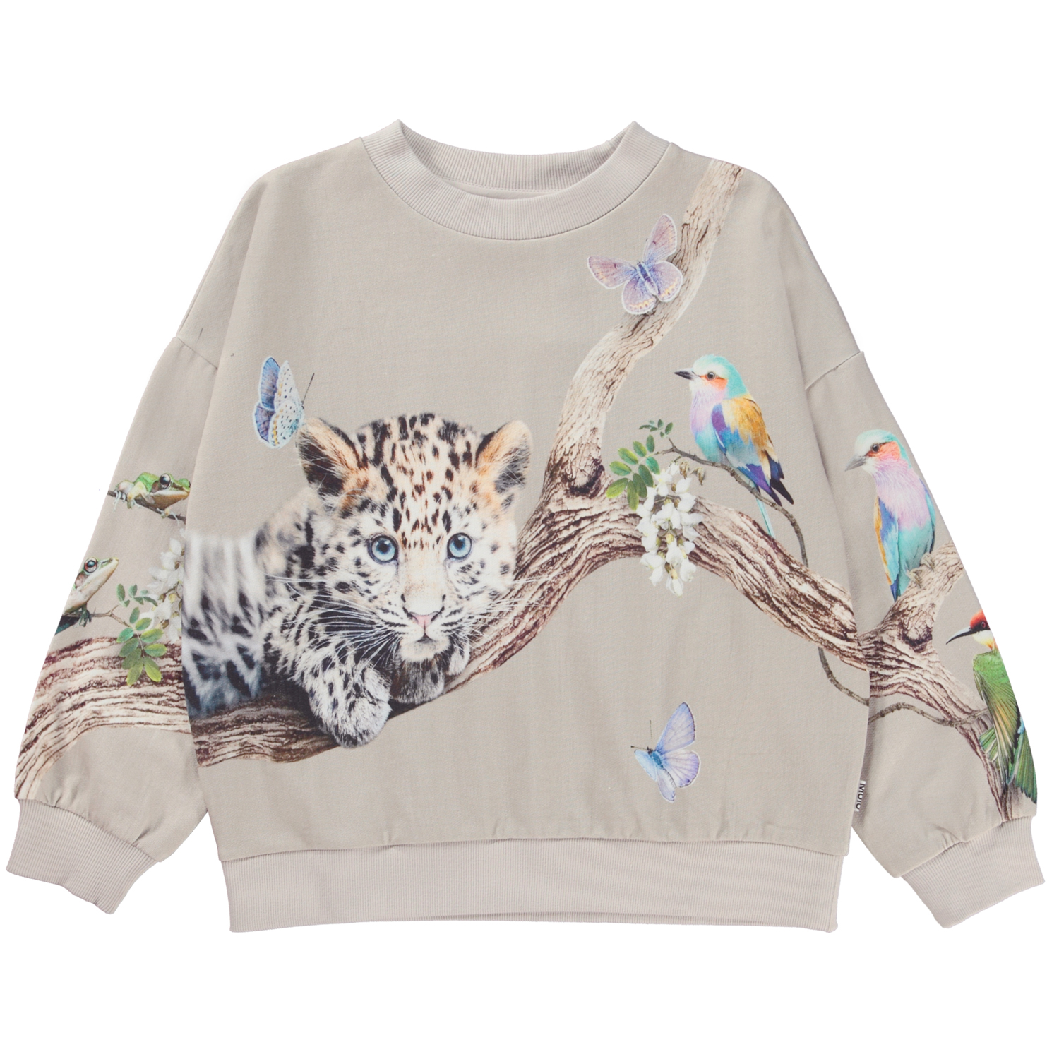 Maxi ist ein graues Sweatshirt aus 100 % Öko-Baumwolle. Das Sweatshirt ist an Hals, Handgelenken und Hüften gerippt. Maxi ist mit dem Placement-Druck Tree Living bedruckt, auf dem hoch oben zwischen Vögeln und Schmetterlingen ein Leopardenjunges an einem Ast hängt.