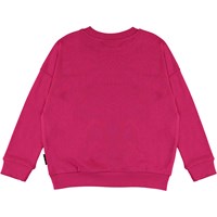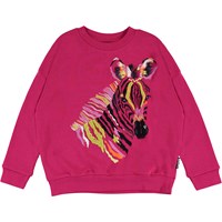 Maxi ist ein fuchsia-farbendes Sweatshirt mit gesticktem Zebra auf der Vorderseite. Die Bluse hat drop-down Schultern, sowie unten, am Ärmelende und am Hals eine Rippkante