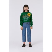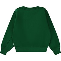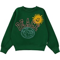 Grünes Sweatshirt mit Stickerei auf der Vorderseite. Die Stickerei besteht aus einem blauen Globus, mit einer fröhlichen Sonne und einer Botschaft über „Peace“. Dieses Sweatshirt besteht aus 100% Baumwolle, hat einen Rundhalsausschnitt mit Rippbündchen, Rippbündchen an Ärmeln und Hüfte und eine normale Passform.
