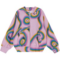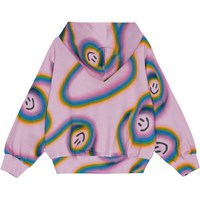 Rosa zip-up Hoodie aus Öko-Baumwolle. Das Sweatshirt hat eine lockere Passform und Taschen auf der Vorderseite. An den Ärmeln und am Saum befindet sich ein breiter gerippter Abschluss. Der Aufdruck auf dem Sweatshirt zeigt schwebende Regenbögen, die lächelnde Gesichter formen.