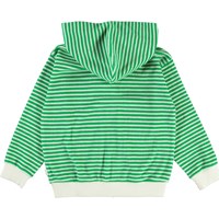 Flour ist ein grün-weiß gestreifter Hoodie aus Frottee. Die Bluse hat einen Reißverschluss und eine Kängurutasche auf der Vorderseite. Kombinieren Sie die Bluse mit den passenden Shorts.