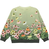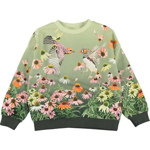 Mika ist ein grünes Sweatshirt mit schönem Blumenfeld- und Vogeldruck.