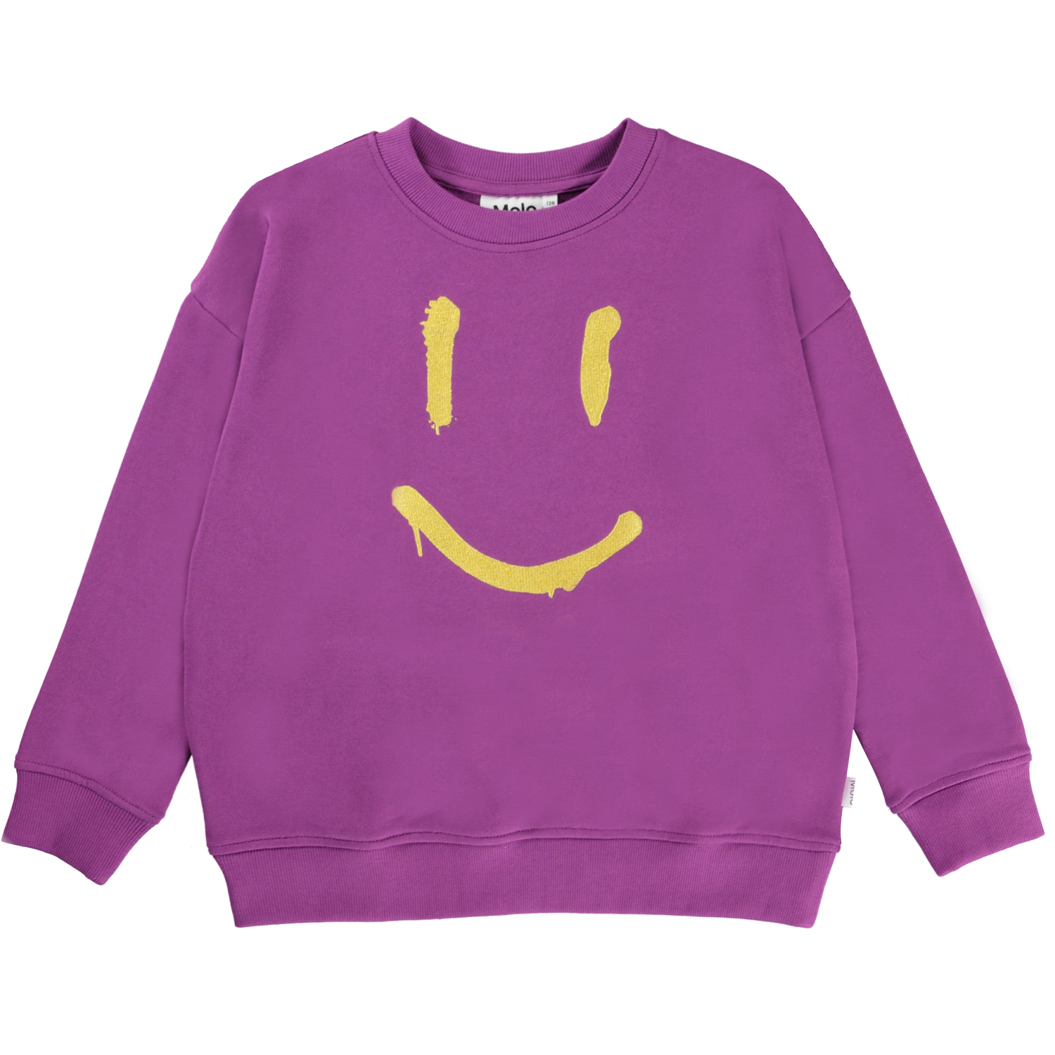 Mika ist ein lila Sweatshirt mit einem Smiley auf der Vorderseite. Die Bluse hat einen Rundhalsausschnitt.