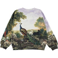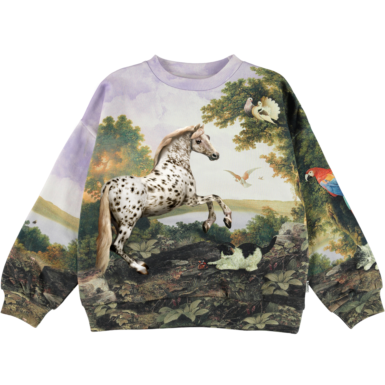 Mika ist ein schönes Sweatshirt mit einem Aufdruck eines steilen Pferdes auf der Vorderseite und einer wunderschönen Natur im Hintergrund. Der Druck sieht fast aus wie ein Gemälde.