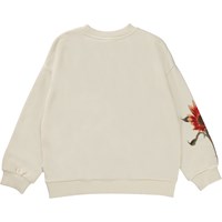 Wollweißes Sweatshirt mit Frontdruck. Der Druck besteht aus einem Pferd, das steht und all die schönen roten Sonnenblumen auf dem Feld genießt. Wenn Du genau hinsiehst, kannst Du sehen, dass eine der roten Sonnenblumen auf dem Arm rausgewachsen ist. Dieses Sweatshirt besteht aus 100% Baumwolle, hat einen Rundhalsausschnitt mit Rippbündchen, Rippbündchen an Ärmeln und Hüfte und eine lockere Passform.