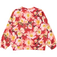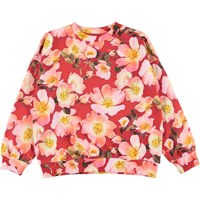 Mika ist ein rotes Sweatshirt mit einem Aufdruck aus großen rosa Blumen.