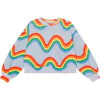 Hellblaues Sweatshirt aus Öko-Baumwolle mit einem durchgehenden Graffiti-Print von Molos ikonischem Regenbogen. Das Sweatshirt hat einen Rundhalsausschnitt, Rippbündchen an Hals, Saum und Ärmeln sowie eine übergroße Passform.