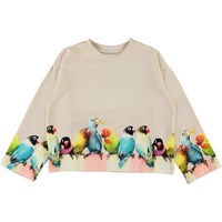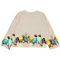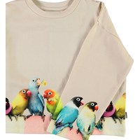 Mikko ist ein rosa Sweatshirt mit Druck von kleinen Vögeln die in einer Reihe an der Unterseite des Pullover und an den Ärmeln sitzen. Das Sweatshirt hat eine kurze und breite Passform. Ecocert Greenlife, certifikationsnr. 197496