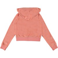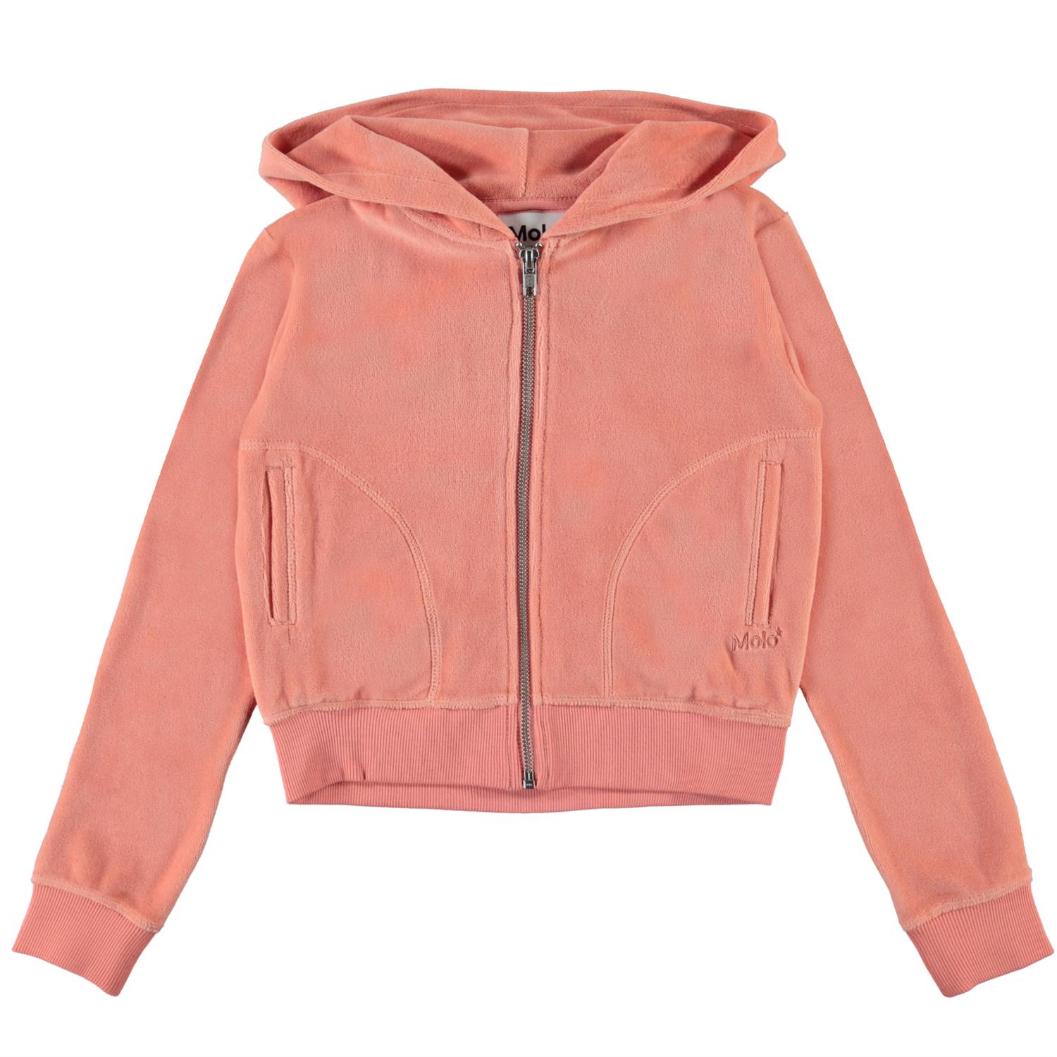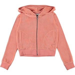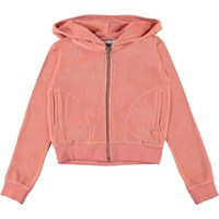 Milla ist ein korallenfarbener Velours-Hoodie. Der Pullover hat einen Reißverschluss und Taschen vorne. Kombiniere den Pullover mit einer passenden Hose.