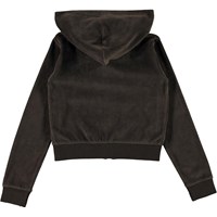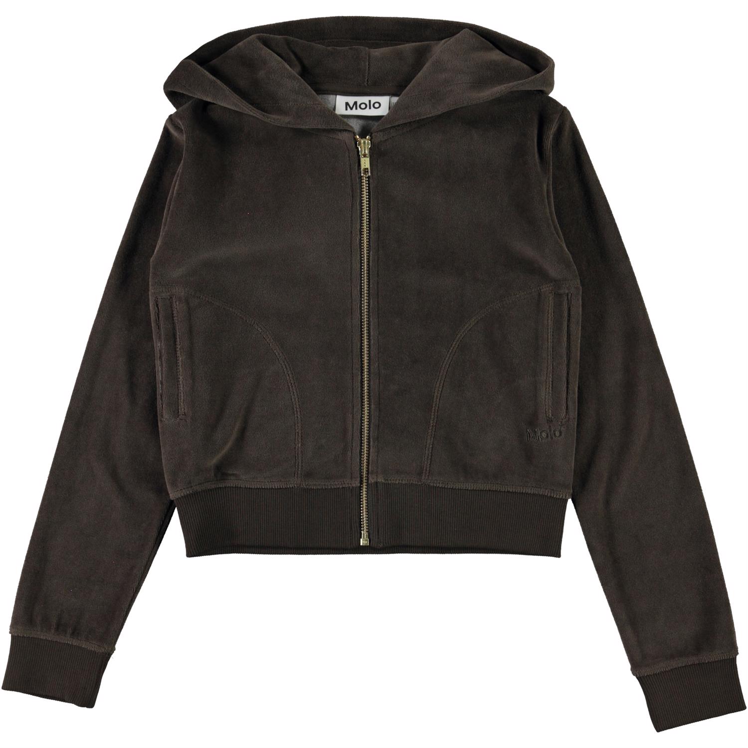 Milla ist ein brauner Velours-Hoodie. Der Pullover hat einen Reißverschluss und Taschen vorne. Kombiniere die Bluse mit einer passenden Hose.