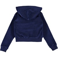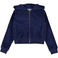 Milla ist ein blauer Velour-Hoodie. Die Bluse hat vorne einen Reißverschluss und Taschen. Kombinieren Sie die Bluse mit einer passenden Hose.