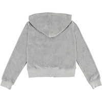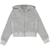Milla ist ein hellgrauer Velours-Hoodie. Die Bluse hat einen Reißverschluss und Taschen auf der Vorderseite. Kombinieren Sie die Bluse mit einer passenden Hose.