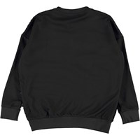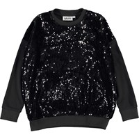 Mitha ist ein schwarzes Sweatshirt mit Pailletten auf der Vorderseite. Die Bluse hat drop-down Schultern, sowie unten, am Ärmelende und am Hals eine Rippkante