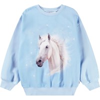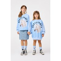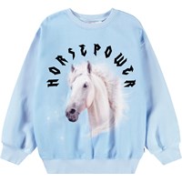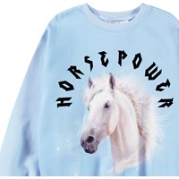 Hellblaues Sweatshirt aus weicher Öko-Baumwolle mit gerippten Kanten am Hals, an den Ärmeln und am unteren Saum des Sweatshirts. Das Sweatshirt hat eine lockere Passform mit einem Frontdruck eines weißen Pferdes und dem Text 'Horse Power'.