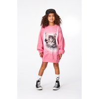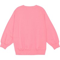 Rosafarbenes Sweatshirt aus Öko-Baumwolle mit großem Katzenprint, dem Text „More Love“ und Strassdetails auf der Vorderseite. Der Pullover hat einen Rundhalsausschnitt, tiefe Schulternähte und lange Ärmel. Rippbündchen am Ausschnitt, unten an den Ärmeln und unten.