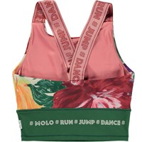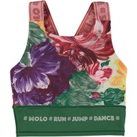 Sportoberteil mit Blumenmotivdruck aus sichtbarem Pinselstrichen in tiefen Farben. Das Oberteil hat breite rosa Träger mit Molo-Textdruck, während die Unterseite des Oberteils grün ist. Das Oberteil ist bequem und besteht aus technischen Materialien, was bedeutet, dass es sowohl bei hoher Intensität als auch zum Entspannen verwendet werden kann. Die Sportkollektion von Molo wird mit einer einzigartigen Hochleistungstechnologie namens HeiQ Smart Temp hergestellt, die die natürliche Kühlung des Körpers unterstützt. Die Kühlfunktion wird aktiviert, wenn Sie heiß und verschwitzt sind. Die Kühlfunktion wird deaktiviert, wenn der Körper abgekühlt ist. HeiQ Smart Temp sorgt für optimalen Komfort und Leistung. Unabhängig als sicher für die Haut getestet.