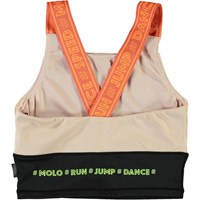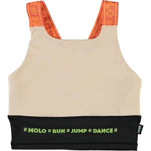 Oliva ist ein Sportoberteil in zartem Rosa mit einem schwarzer Unterseite. Die Oberseite hat orange breite Träger mit Textdruck. Olivia ist Teil der Sportkollektion von Molo, die dazu beiträgt, Mode und Sport enger miteinander zu verbinden. Das Oberteil ist bequem und besteht aus technischen Materialien, was bedeutet, dass es sowohl bei hoher Intensität als auch zum Entspannen verwendet werden kann. Die Sportkollektion von Molo basiert auf der einzigartigen Hochleistungstechnologie HeiQ Smart Temp, die die natürliche Kühlung des Körpers unterstützt. Die Kühlfunktion wird aktiviert, wenn Sie heiß und verschwitzt sind. Die Kühlfunktion wird deaktiviert, wenn der Körper abgekühlt ist. HeiQ Smart Temp sorgt für optimalen Komfort und Leistung. Unabhängig getestet als hautverträglich.