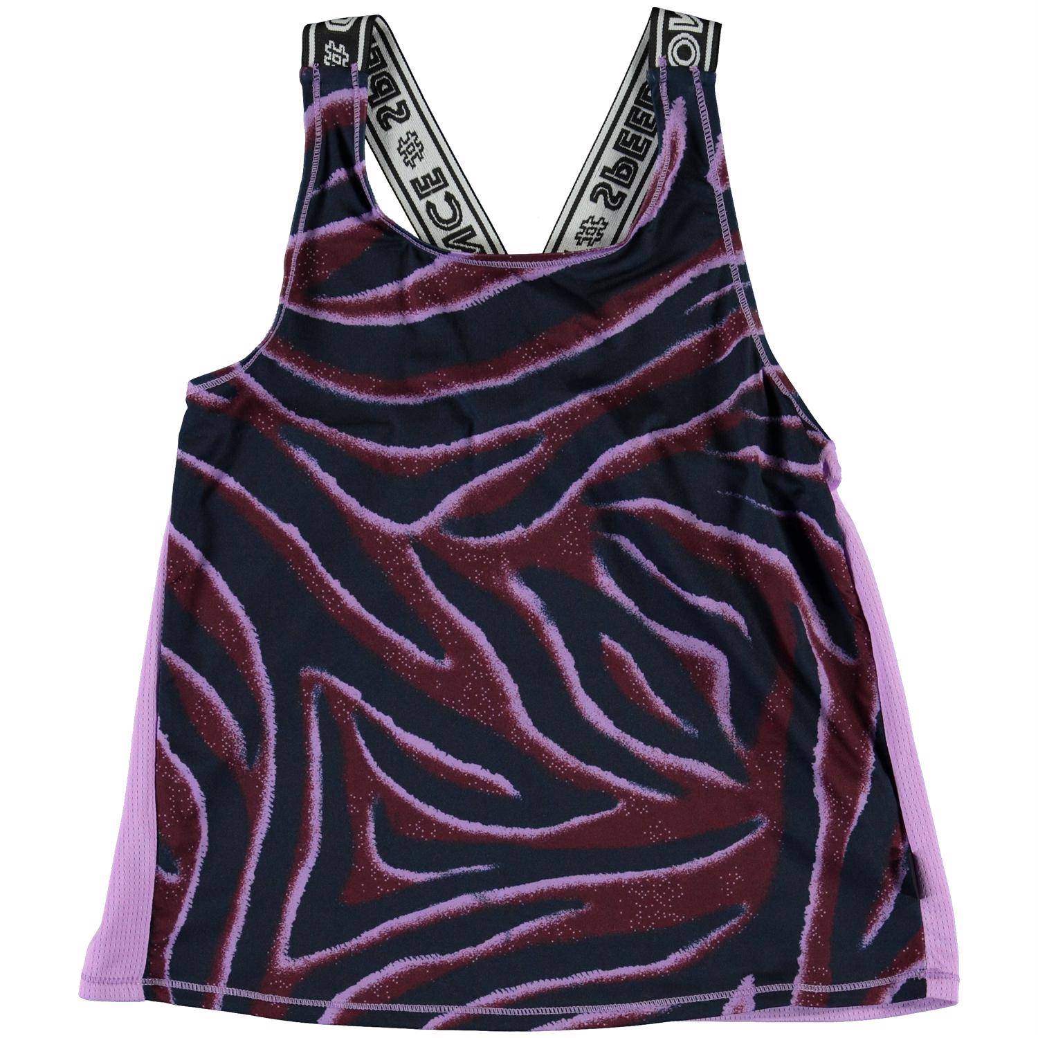 Oriana ist ein Top mit Zebradruck und ein lila Rücken sowie breiten Trägern mit Text. Das Top ist Teil der neuen Sportkollektion von Molo, die Mode und Sport enger miteinander verbindet. Das Oberteil ist bequem und besteht aus technischen Materialien, die es ermöglichen, es sowohl bei hoher Intensität als auch beim Entspannen zu verwenden. Die Sportkollektion von Molo ist auf einer einzigartigen High-Performance-Technologie namens HeiQ Smart Temp basiert, die die natürliche Kühlung des Körpers unterstützt. Die Kühlfunktion wird aktiviert, wenn mann heiß und verschwitzt ist. Die Kühlfunktion wird deaktiviert, wenn der Körper abgekühlt ist. HeiQ Smart Temp sorgt für optimalen Komfort und Leistung. Unabhängig getestet als hautverträglich.