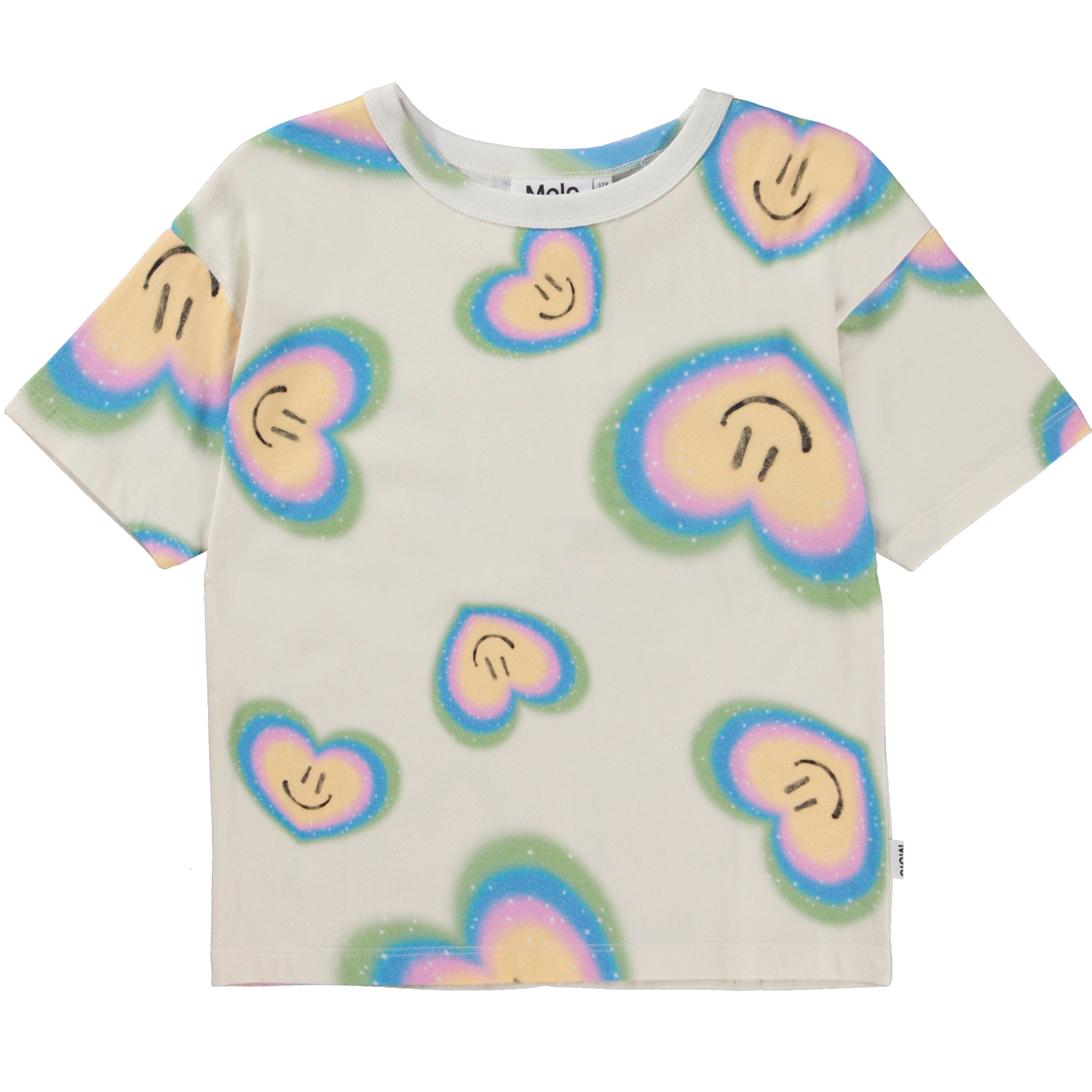 Cremeweißes T-Shirt mit Allover-Aura-Herzdruck. Stelle Dir vor, dass alles eine Aura hat – Menschen, Pflanzen und Tiere. Der Druck besteht aus Aura-Herzen, die vor Farben, Lächeln und Liebe strahlen. Aurafarben, die wie die Farben des Regenbogens sind, die Farben und Emotionen in unserem Körper, unserem inneren Wesen, widerspiegeln. Wir sind bereit, unser Herz für alles zu öffnen, was wir nicht sehen können, und zu glauben, dass es zwischen Himmel und Erde noch mehr gibt. Dieses T-Shirt besteht aus 100% Baumwolle, hat einen Rundhalsausschnitt mit Rippbündchen, kurze Ärmel und eine normale Passform