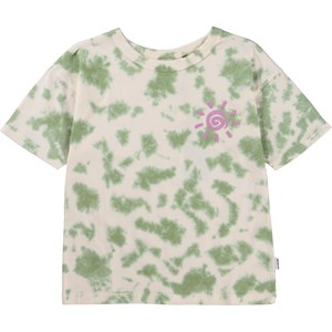 Grün-weißes T-Shirt im Batik-Print mit lila Placement-Frontprint. Der Druck ist eine lila Sonne, die auf jeden scheint, den Du triffst. Dieses T-Shirt besteht aus 100% Baumwolle, hat einen Rundhalsausschnitt mit Rippbündchen, kurze Ärmel und eine normale Passform.