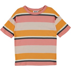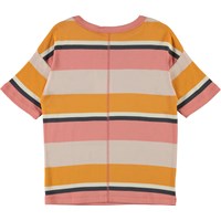 Rabecke ist ein gestreiftes T-Shirt in Gelb, Pink und Beige. Das T-Shirt hat fallende Schultern und eine gute Weite.