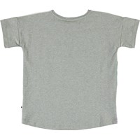 Die Tiere balancieren auf der Vorderseite des Raeesa-T-Shirts hoch übereinander. Raeesa ist ein graues T-Shirt mit kurzen Ärmeln und einer leicht breiten Passform.