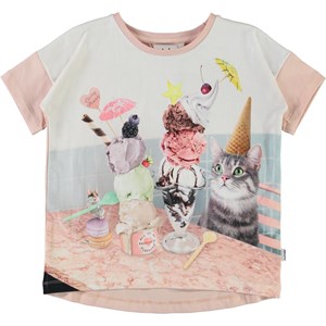 Raeesa ist ein T-Shirt mit einer oversized Passform und humoristischem Druck einer Katze mit einer Waffel auf dem Kopf, die auf zwei Türme von Eisdesserten guckt. Sind wir nicht alle von Katzen und Eiswaffeln begeistert? Der T-Shirt hat eine rosa Rückseite. Ecocert Greenlife, certifikationsnr. 197496.