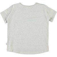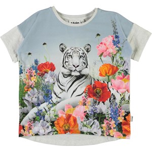 Raeesa ist ein T-Shirt mit einer oversized Passform und humoristischen Druck eines weißen Tigers in einem Feld von schönen Blumen. T-Shirt hat hellgrau Rückseite. Ecocert Greenlife, certifikationsnr. 197496.