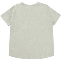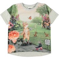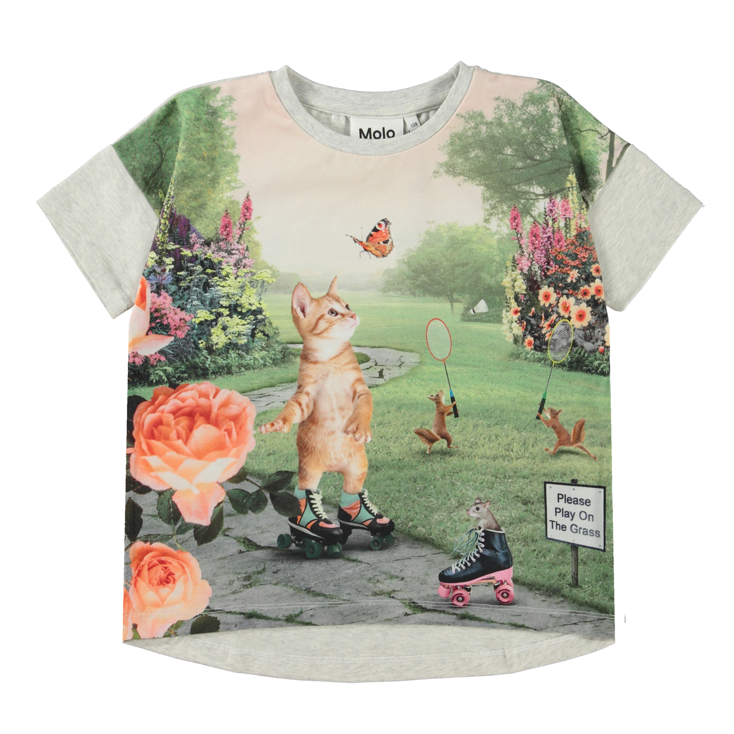 Raeesa ist ein T-Shirt aus Öko-Baumwolle mit grauem Ausschnitt, Ärmeln und Rücken. Die Rückseite hat einen fallenden Saum und die Vorderseite ist im Park Play-Print, wo die Katze auf Rollschuhen und das Eichhörnchen im Park Badminton spielt.