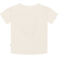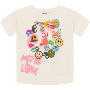Weißes T-Shirt aus Öko-Baumwolle mit mehrfarbigem Aufdruck auf der Vorderseite mit Yin- und Yang-Aufklebern. Das T-Shirt hat eine lockere Passform, einen Rundhalsausschnitt und ist hinten länger als vorne.
