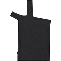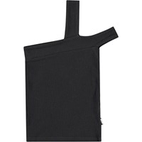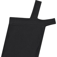 Eng anliegendes schwarzes Oberteil aus dehnbarem weichem Viskoseripp. Das Oberteil hat zwei Träger auf der linken Schulter, einer verläuft über die Schulter, während der andere darunter sitzt.