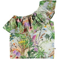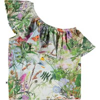Mehrfarbiges One-Shoulder-Crop-Top mit breiten Rüschen und Allover-Print aus 100% Öko-Baumwolle. Der Druck zeigt eine wunderschöne Blumenwiese mit Schmetterlingen. Das Oberteil hat eine normale Passform.